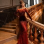Un delizioso completo da sera composto da un abito a maniche lunghe con silhouette godet e strascico staccabile. Il corsetto aderente in vita dona tenerezza alla modella, è completato da una scollatura a barca sul davanti, si allaccia sul retro con bottoni in velluto fatti a mano. La combinazione della nobile lucentezza del velluto in contrasto con delicati inserti in tessuto a rete traslucido e decorazioni di elementi in guipure ricamati con cristalli scintillanti di varie forme e dimensioni crea un look regale interessante e indimenticabile nel complesso.